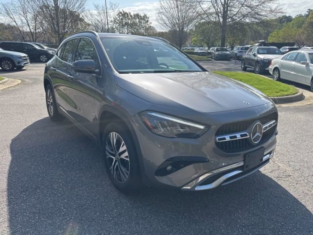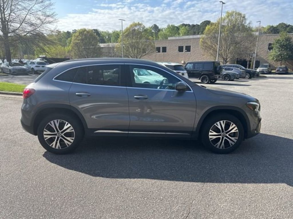 Certified. Gray 2025 Mercedes-Benz GLA GLA 250 4MATIC® 2.0L I4 Turbocharged 4-Wheel Disc Brakes, 6 Speakers, ABS brakes, Active Distance Assist DISTRONIC®, Air Conditioning, Alloy wheels, AM/FM radio: SiriusXM, Apple CarPlay®/Android Auto®, Auto High-beam Headlights, Auto-dimming door mirrors, Auto-dimming Rear-View mirror, Automatic temperature control, Brake assist, Bumpers: body-color, Burmester® Surround Sound System with Dolby Atmos, Child-Seat-Sensing Airbag, Delay-off headlights, Driver door bin, Driver vanity mirror, Dual front impact airbags, Dual front side impact airbags, Electronic Stability Control, Emergency communication system: eCall Emergency System and Active Emergency Stop Assist, Exterior Parking Camera Rear, Four wheel independent suspension, Front anti-roll bar, Front Bucket Seats, Front Center Armrest, Front dual zone A/C, Front fog lights, Front Power Comfort Seats, Front reading lights, Fully automatic headlights, Garage door transmitter, Heated door mirrors, Heated Seats, Heated Steering Wheel, Heated Washer System, Illuminated entry, Knee airbag, Leather steering wheel, LED Logo Projector, Low tire pressure warning, MB-Tex Upholstery, Memory seat, Occupant sensing airbag, Outside temperature display, Overhead airbag, Overhead console, Panic alarm, Panoramic Sliding Sunroof, Passenger door bin, Passenger vanity mirror, Power door mirrors, Power driver seat, Power Liftgate, Power passenger seat, Power steering, Power windows, Premium audio system: MBUX, Radio data system, Radio: Mercedes-Benz User Experience (MBUX), Rain sensing wipers, Rear anti-roll bar, Rear fog lights, Rear reading lights, Rear window defroster, Rear window wiper, Remote keyless entry, Security system, Speed control, Speed-sensing steering, Split folding rear seat, Spoiler, Steering wheel mounted audio controls, Tachometer, TBD Axle Ratio, Telescoping steering wheel, Tilt steering wheel, Traction control, Trip computer, Turn signal indicator mirrors, Variably intermittent wipers, Wheels: 18" Twin 5-Spoke, Winter Package.