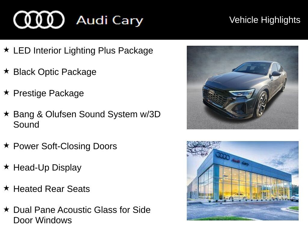 Daytona Gray Pearl Effect 2024 Audi Q8 Sportback e-tron Prestige S line Single-Speed Automatic Electric ZEV quattro CARFAX One-Owner. Animation for Headlights & Taillights, Bang & Olufsen Sound System w/3D Sound, Black Optic Package, Digital Matrix LED Headlights, Dual Pane Acoustic Glass for Side Door Windows, Front Passenger Power Lumbar, Front Passenger Seat Memory, Head-Up Display, Heated Rear Seats, High-Gloss Black Front Grille & Mask, High-Gloss Black Rear Diffuser Inlay, High-Gloss Black Window Surrounds, Individual Contour Heated & Ventilated Front Seats, Intersection Assist, Leather Trimmed Dash/Armrest/Center Console, LED Interior Lighting Plus Package, Manual Sunshades for Rear Doors, Park Assist Plus, Power Soft-Closing Doors, Prestige Package, Single Frame Projector Lighting, Top View Camera System, Traffic Sign Recognition, Valcona/Milano Leather Seat Trim, Wheels: 21" 5-Arm Aero Structure Design, Wireless Phone Charging Pad.