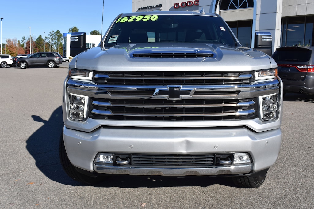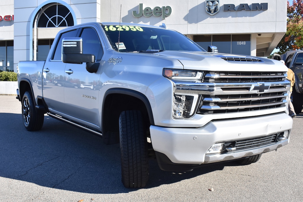 CARFAX One-Owner. Silver Ice Metallic 2022 Chevrolet Silverado 2500HD High Country 4WD 10-Speed Automatic Duramax 6.6L V8 Turbodiesel 10-Way Power Driver Seat Adjuster w/Lumbar, 10-Way Power Passenger Seat Adjuster w/Lumbar, 12-Volt Rear Auxiliary Power Outlet, 120-Volt Bed Mounted Power Outlet, 120-Volt Instrument Panel Power Outlet, 15" Diagonal Multicolor Head-Up Display, 170 Amp Alternator, 220 Amp Alternator, 3.42 Rear Axle Ratio, 4-Wheel Disc Brakes, 6" Rectangular Chromed Tubular Assist Steps, 7 Speakers, 720 Cold-Cranking Amps Heavy-Duty Battery, 8" Driver Information Center, ABS brakes, Advanced Trailering System, Air Conditioning, Alloy wheels, AM/FM radio: SiriusXM with 360L, Auto-dimming door mirrors, Auto-Dimming Inside Rear-View Mirror, Auto-dimming Rear-View mirror, Automatic Emergency Braking, Automatic temperature control, Bed View Camera w/2 Trailer Camera Provisions, Black Chevytec Spray-On Bedliner w/Chevrolet Logo, Bluetooth® For Phone, BOSE Premium 7-Speaker Sound System, Brake assist, Bumpers: body-color, Chevrolet Connected Access Capable, Chrome Front Grille, Chrome Mirror Caps, Color-Keyed Carpeting Floor Covering, Compass, Deep-Tinted Glass, Delay-off headlights, Driver Memory, Dual Charge-Only USB Ports (2nd Row), Dual front impact airbags, Dual front side impact airbags, Electric Rear-Window Defogger, Electrical Lock Control Steering Column, Electronic Cruise Control w/Set & Resume Speed, Electronic Stability Control, Engine Block Heater, Exhaust Brake, Exterior Parking Camera Rear, EZ Lift Power Lock & Release Tailgate, Floor-Mounted Center Console, Following Distance Indicator, Forward Collision Alert, Front anti-roll bar, Front Black Bowtie Emblem (LPO), Front Bucket Seats, Front Carpeted Floor Mats, Front Chrome Recovery Hooks, Front dual zone A/C, Front fog lights, Front LED Fog Lamps, Front reading lights, Front wheel independent suspension, Fully automatic headlights, Garage door transmitter, Gooseneck/5th Wheel Prep Package, HD Surround Vision w/2 Trailer View Camera Provisions, Heated & Auto-Dim Pwr Vertical Trailering Mirrors, Heated 2nd Row Outboard Seats, Heated door mirrors, Heated Driver & Front Outboard Passenger Seating, Heated front seats, Heated Steering Wheel, Heated steering wheel, High Country Deluxe, Hill Descent Control, Hitch Guidance w/Hitch View, Illuminated entry, Integrated Trailer Brake Controller, IntelliBeam Automatic High Beam On/Off, Keyless Open & Start, Lane Change Alert w/Side Blind Zone Alert, Lane Departure Warning System, Leather-Wrapped Steering Wheel, LED Cargo Area Lighting, Low tire pressure warning, Manual Tilt & Telescoping Steering Column, Memory seat, Multi-Flex Tailgate, Navigation System, Not Equipped w/Front & Rear Park Assist, Occupant sensing airbag, Off-Road Suspension, OnStar & Chevrolet Connected Services Capable, Outside temperature display, Overhead airbag, Panic alarm, Perforated Leather-Appointed Seat Trim, Polished Exhaust Tip, Power Door Locks, Power door mirrors, Power driver seat, Power Front Windows w/Driver Express Up/Down, Power Front Windows w/Passenger Express Up/Down, Power passenger seat, Power Rear Windows w/Express Down, Power Sliding Rear Window w/Defogger, Power steering, Power Sunroof, Power windows, Power-Retractable Assist Steps, Preferred Equipment Group 3LZ, Premium audio system: Chevrolet Infotainment 3 Premium, Radio: Chevrolet Infotainment 3 Premium System, Rear Carpeted Floor Mats, Rear Cross Traffic Alert, Rear step bumper, Rear Wheelhouse Liners, Rear window defroster, Remote keyless entry, Remote Vehicle Starter System, Safety Alert Seat, Safety Package II, Security system, SiriusXM w/360L, Speed control, Speed-sensing steering, Split folding rear seat, Standard Tailgate, Steering Wheel Audio Controls, Steering wheel mounted audio controls, Suspension Package, Tachometer, Technology Package, Telescoping steering wheel, Tilt steering wheel, Traction control, Trip computer, Turn signal indicator mirrors, Ultrasonic