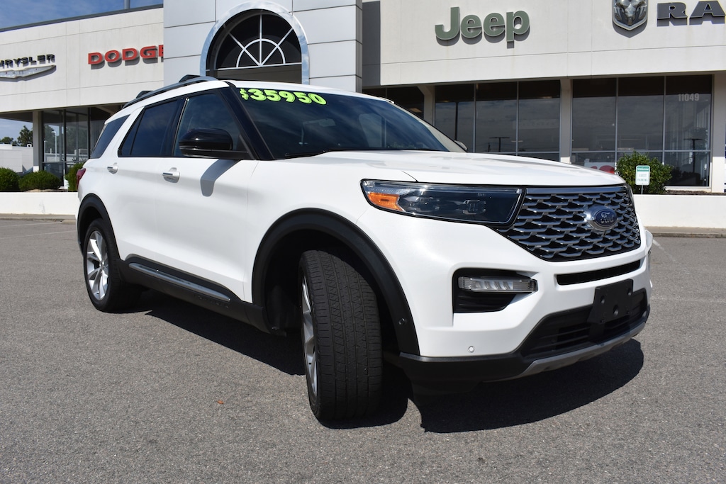 Star White Metallic Tri-Coat 2021 Ford Explorer Platinum 4WD 10-Speed Automatic 3.0L EcoBoost V6 10.1" LCD Capacitive Portrait Touchscreen, 12 Speakers, 2 Additional Speakers, 3.31 Non-Limited-Slip Axle Ratio, 3rd row seats: bench, 4-Wheel Disc Brakes, ABS brakes, Air Conditioning, Alloy wheels, AM/FM radio: SiriusXM, Auto High-beam Headlights, Auto-dimming door mirrors, Auto-dimming Rear-View mirror, Automatic temperature control, Brake assist, Bumpers: body-color, Compass, Delay-off headlights, Dual front impact airbags, Dual front side impact airbags, Electronic Stability Control, Emergency communication system: SYNC 3 911 Assist, Equipment Group 601A, Exterior Parking Camera Rear, FordPass Connect, Four wheel independent suspension, Front anti-roll bar, Front dual zone A/C, Front fog lights, Fully automatic headlights, Garage door transmitter: HomeLink, Genuine wood dashboard insert, Heated door mirrors, Heated front seats, Heated rear seats, Heated steering wheel, Illuminated entry, Knee airbag, Leather Htd/Ventilated Sport Captain's Chairs, Leather steering wheel, Low tire pressure warning, Memory seat, Navigation System, Occupant sensing airbag, Outside temperature display, Overhead airbag, Overhead console, Panic alarm, Power door mirrors, Power driver seat, Power Liftgate, Power passenger seat, Power steering, Power windows, Premium Technology Package, Radio data system, Radio: B&O Sound System by Bang & Olufsen, Rain sensing wipers, Rear air conditioning, Rear anti-roll bar, Rear window defroster, Rear window wiper, Remote keyless entry, Roof rack: rails only, Security system, SelectShift Capability w/Paddle Shifters, Speed control, Speed-sensing steering, Speed-Sensitive Wipers, Split folding rear seat, Spoiler, Steering wheel memory, Steering wheel mounted audio controls, SYNC 3 Communications & Entertainment System, SYNC 3/Apple CarPlay/Android Auto, Tachometer, Telescoping steering wheel, Tilt steering wheel, Traction control, Trip computer, Turn signal indicator mirrors, Twin Panel Moonroof, Variably intermittent wipers, Ventilated front seats, Voice-Activated Touchscreen Navigation System, Wheels: 21" Bright Machined-Face Aluminum.