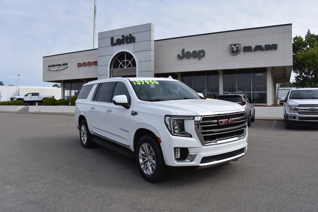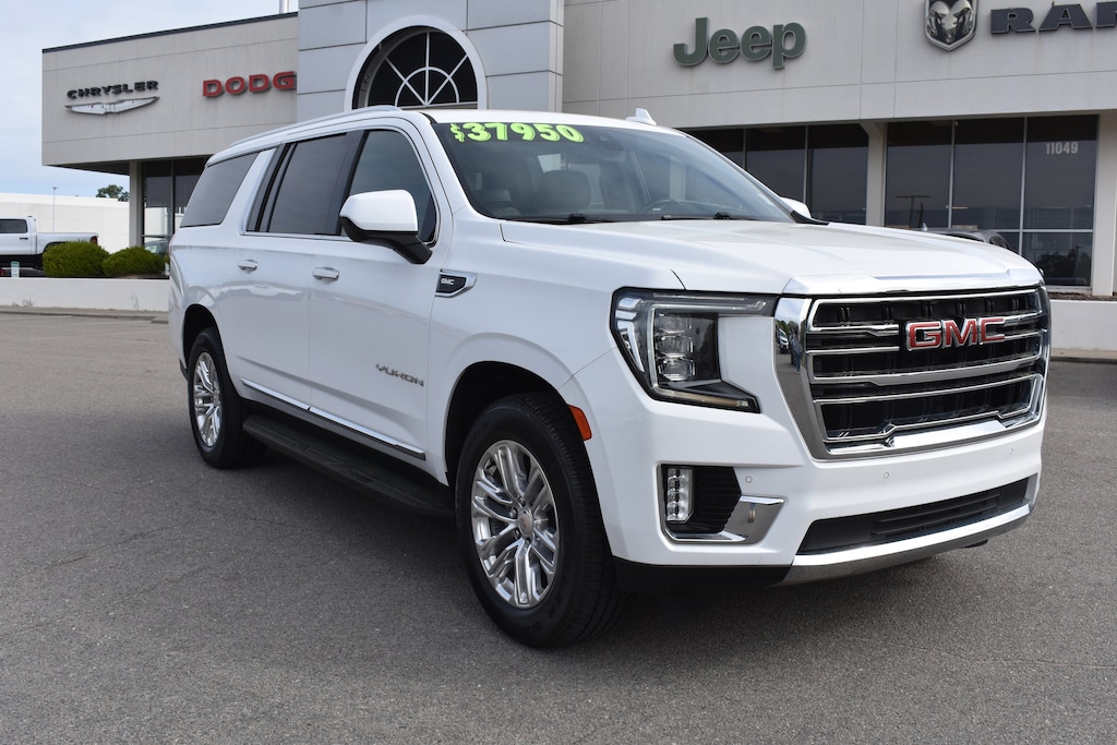 Summit White 2021 GMC Yukon XL SLT 4WD 10-Speed Automatic with Overdrive EcoTec3 5.3L V8 12-Way Power Seat Adjusters, 2 Presets For Power Driver Seat, 3.23 Rear Axle Ratio, 3rd row seats: split-bench, 4-Wheel Disc Brakes, 9 Speakers, ABS brakes, Air Conditioning, Alloy wheels, AM/FM radio: SiriusXM with 360L, Apple CarPlay/Android Auto, Auto High-beam Headlights, Auto-dimming Rear-View mirror, Automatic Emergency Braking, Automatic temperature control, Bodyside moldings, Bose 9-Speaker Stereo Audio System Feature, Brake assist, Bright Chrome Bodyside Moldings, Bright Front & Rear Door Sill Plates, Bumpers: body-color, Chrome Door Handles w/Body-Color Strip, Compass, Delay-off headlights, Dual front impact airbags, Dual front side impact airbags, Electronic Stability Control, Emergency communication system: OnStar and GMC connected services capable, Following Distance Indicator, Forward Collision Alert, Four wheel independent suspension, Front anti-roll bar, Front dual zone A/C, Front fog lights, Front Pedestrian Braking, Front reading lights, Fully automatic headlights, Garage door transmitter, Hands-Free Power Programmable Rear Liftgate, HD Radio, Heated & Ventilated Driver & Front Passenger Seats, Heated door mirrors, Heated Driver & Front Passenger Seats, Heated front seats, Illuminated entry, Inside Rear-View Auto-Dimming Mirror, IntelliBeam Automatic High Beam On/Off, Lane Change Alert w/Side Blind Zone Alert, Lane Keep Assist w/Lane Departure Warning, Leather steering wheel, Low tire pressure warning, Memory seat, Occupant sensing airbag, Outside temperature display, Overhead airbag, Panic alarm, Perforated Leather Seating Surfaces, Power door mirrors, Power driver seat, Power Liftgate, Power passenger seat, Power steering, Power windows, Preferred Equipment Group 4SA, Premium Smooth Ride Suspension, Radio: AM/FM/SiriusXM, Rain sensing wipers, Rear air conditioning, Rear anti-roll bar, Rear Cross Traffic Alert, Rear window defroster, Rear window wiper, Remote keyless entry, Roof rack: rails only, Safety Alert Seat, Security system, SiriusXM w/360L, Speed control, Speed-sensing steering, Split folding rear seat, Spoiler, Steering wheel mounted audio controls, Tachometer, Telescoping steering wheel, Tilt steering wheel, Traction control, Trip computer, Universal Home Remote, Variably intermittent wipers, Ventilated front seats, Voltmeter, Wheels: 20" x 9" 6-Spoke Polished Aluminum.