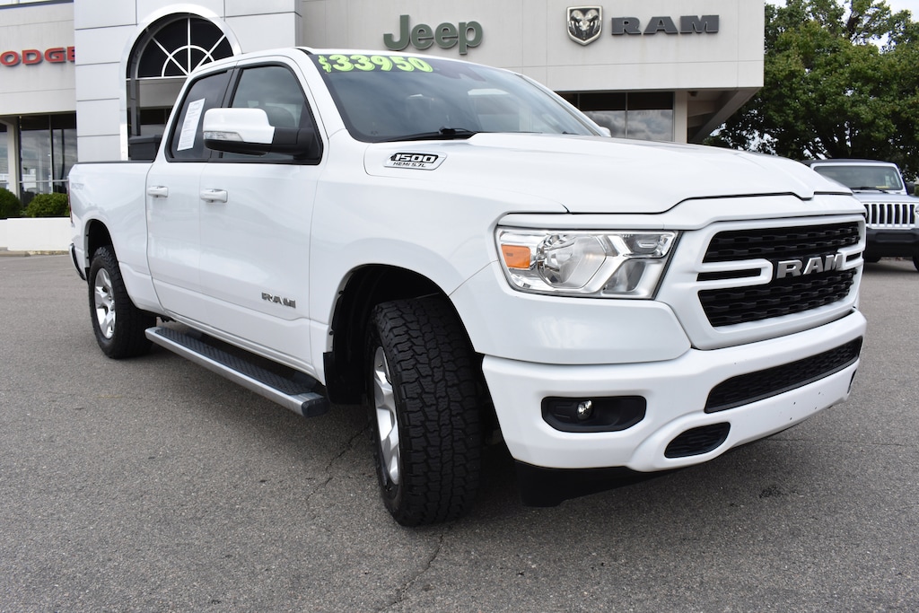 Bright White Clearcoat 2022 Ram 1500 Big Horn/Lone Star 4WD 8-Speed Automatic HEMI 5.7L V8 Multi Displacement VVT 3 Rear Seat Head Restraints, 3.92 Rear Axle Ratio, 4 Way Front Headrests, 4-Wheel Disc Brakes, 48V Belt Starter Generator, 4G LTE Wi-Fi Hot Spot, 6 Speakers, 8.4" Touchscreen Display, ABS brakes, Advanced Brake Assist, Air Conditioning, All Plant-Installed Decals, Alloy wheels, AM/FM radio, Apple CarPlay, Auto-Dimming Exterior Driver Mirror, Auto-Dimming Rear-View Mirror, Big Horn Badge, Big Horn Level 1 Equipment Group, Black Exterior Mirrors, Black Interior Accents, Black Premium Power Mirrors, Bluetooth Handsfree Phone & Audio, Body Color Exterior Mirrors, Body Color Front Bumper, Body Color Premium Power Mirrors, Body Color Rear Bumper w/Step Pads, Brake assist, Bridgestone Brand Tires, Bumpers: chrome, Class IV Receiver Hitch, Cloth Bench Seat, Cluster 3.5" TFT Color Display, Compass, Connectivity - US/Canada, Convex Wide-Angle Mirror Insert, Delay-off headlights, Delete LED Lamp - Floor Console Bin, Deluxe Cloth Bucket Seats, Dual front impact airbags, Dual front side impact airbags, Electronic Stability Control, Emergency communication system: SiriusXM Guardian, Exterior Mirrors Courtesy Lamps, Exterior Mirrors w/Heating Element, Exterior Mirrors w/Supplemental Signals, For Details, Visit DriveUconnect.com, For More Info, Call 800-643-2112, Front anti-roll bar, Front fog lights, Front wheel independent suspension, Full Speed Forward Collision Warning Plus, Fully automatic headlights, Global Telematics Box Module (TBM), Glove Box Lamp, Google Android Auto, GPS Antenna Input, Grille Surround 1 Body Color Texture 2 Black, Illuminated entry, Integrated Center Stack Radio, Integrated Voice Command w/Bluetooth, Lane Keep Assist, Leather steering wheel, Level 1 Safety Group, Low tire pressure warning, Manual Adjust 4-Way Front Passenger Seat, MOPAR Front & Rear Rubber Floor Mats, Occupant sensing airbag, Outside temperature display, Overhead airbag, Panic alarm, ParkView Rear Back-Up Camera, Pedestrian Emergency Braking, Power 2-Way Driver Lumbar Adjust, Power 8-Way Driver Seat, Power Adjustable Pedals, Power door mirrors, Power steering, Power windows, Power-Folding Mirrors, Quick Order Package 25Z Big Horn, Radio data system, Radio: Uconnect 3 w/5" Display, Radio: Uconnect 5 W w/8.4" Display, Rear 60/40 Folding Seat, Rear anti-roll bar, Rear Dome w/On/Off Switch Lamp, Rear Power Sliding Window, Rear step bumper, Rear Window Defroster, Remote keyless entry, Remote Start System, SiriusXM Radio Service, SiriusXM Satellite Radio, Speed control, Split folding rear seat, Sport Appearance Package, Sport Decal, Steering wheel mounted audio controls, Sun Visors w/Illuminated Vanity Mirrors, Tachometer, Telescoping steering wheel, Tilt steering wheel, Traction control, Trailer Brake Control, Trip computer, Universal Garage Door Opener, USB Host Flip, Variably intermittent wipers, Voltmeter, Wheels: 18" x 8" Cast-Aluminum Painted.
