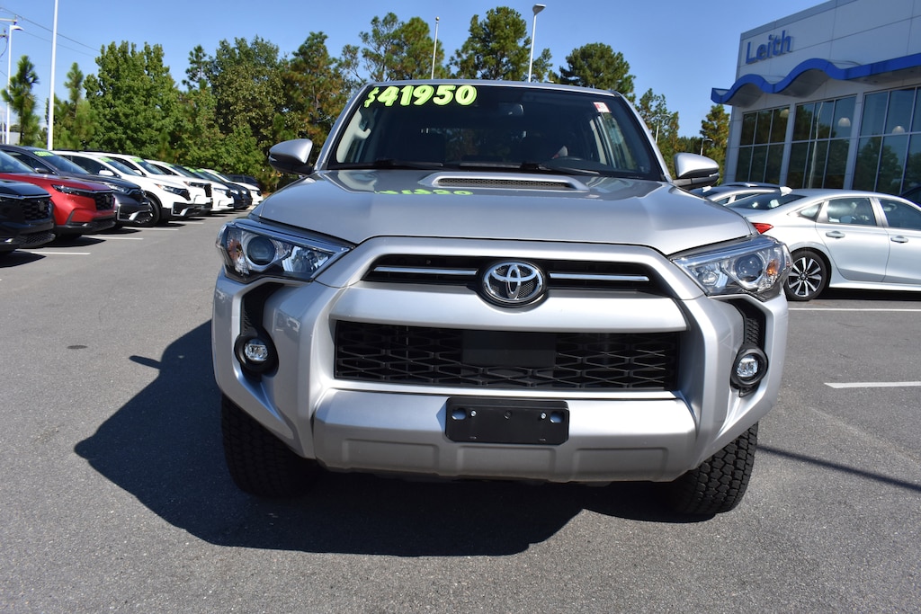 Clean CARFAX. Classic Silver Metallic 2021 Toyota 4Runner TRD Off-Road Premium 4WD 5-Speed Automatic with Overdrive 4.0L V6 SMPI DOHC 3.727 Axle Ratio, 4-Wheel Disc Brakes, 8 Speakers, ABS brakes, Air Conditioning, Alloy wheels, AM/FM radio: SiriusXM, Anti-whiplash front head restraints, Apple CarPlay/Android Auto, Auto High-beam Headlights, Auto-dimming Rear-View mirror, Black Roof Rails, Body Color Heated Mirrors, Brake assist, Bumpers: body-color, Compass, Dual front impact airbags, Dual front side impact airbags, Electronic Stability Control, Emergency communication system: Safety Connect with 1-year trial, Exterior Parking Camera Rear, Front anti-roll bar, Front fog lights, Front wheel independent suspension, Garage Door Opener, Garage door transmitter: HomeLink, Heated door mirrors, Heated Front Bucket Seats, Heated front seats, Illuminated entry, Knee airbag, Leather Shift Knob, Low tire pressure warning, Occupant sensing airbag, Outside temperature display, Overhead airbag, Overhead console, Panic alarm, Passenger vanity mirror, Power door mirrors, Power driver seat, Power passenger seat, Power steering, Power windows, Radio: Premium Audio w/Dynamic Navigation, Rear anti-roll bar, Rear seat center armrest, Rear window defroster, Rear window wiper, Remote keyless entry, Roof rack: rails only, Security system, Softex Synthetic Leather Seat Trim, Speed control, Speed-sensing steering, Split folding rear seat, Spoiler, Steering wheel mounted audio controls, Tachometer, Telescoping steering wheel, Tilt steering wheel, Traction control, Trip computer, Turn signal indicator mirrors, Variably intermittent wipers, Wheels: 17" x 7.5" 7-Spoke Unique Off-Road Alloy.